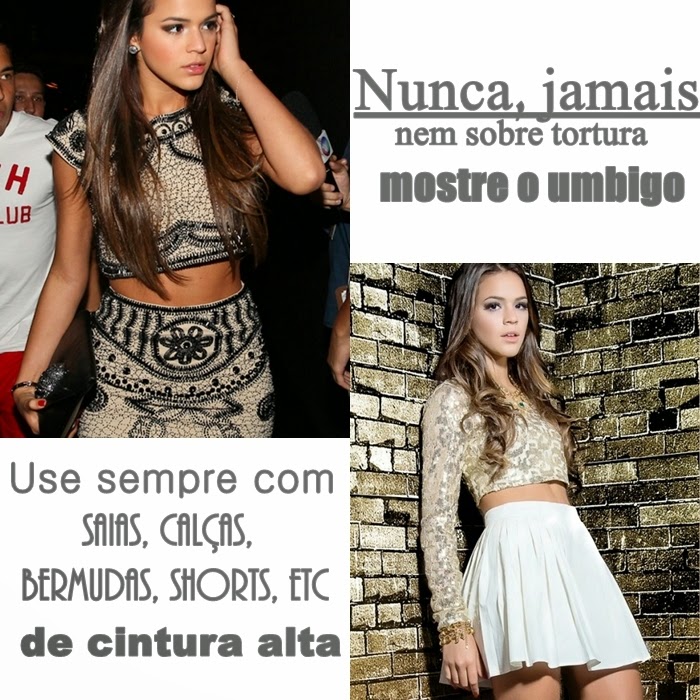 A primeira regrinha é: esconda o umbigo. Mesmo que você se orgulhe de ter um umbigo lindinho ou tenha um piercing nele. Minha dica é: use sempre saia, short, calça, etc, de cintura alta.
