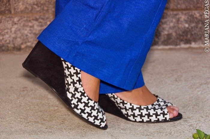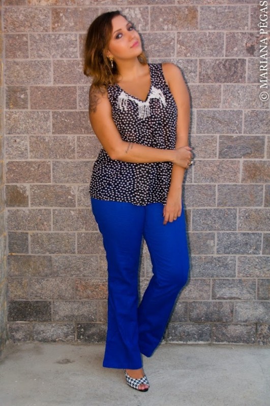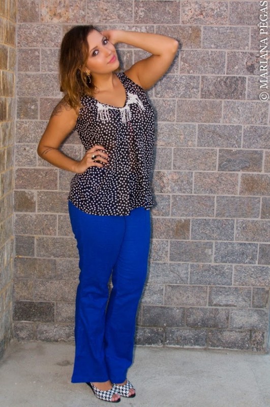 Esse look é ideal para o trabalho. A calça de linho azul Klein, traz para o look descontração e alegria. A blusa com estampa de poá, preto e branco, super fofa e romântica, com o sapato com estampa de pied de poule, ficou super moderno e arrumado.